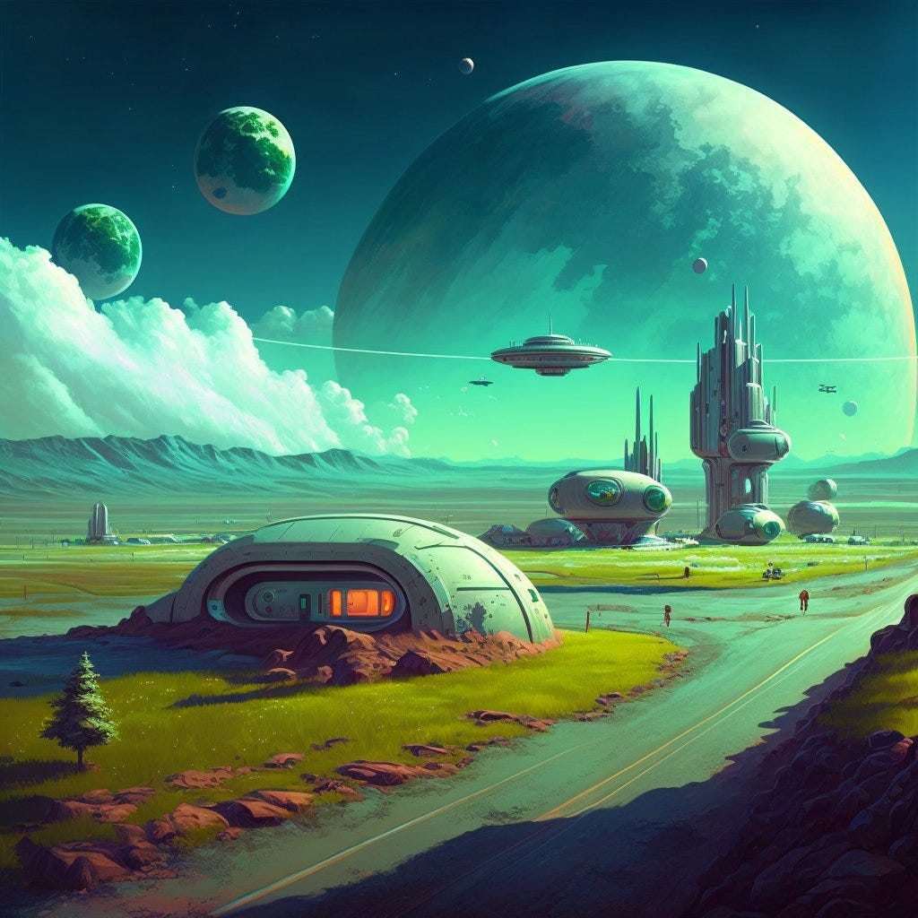The grass lawn formed around Sarah as she beamed down. In the distance there were a number of strange looking buildings. They were each large, but the way it was built, suggested much of them were hidden under ground. Mountains were in the distance, as and beyond that, looming large above the landscape was the planet the moon orbited, as well as two of the other moons. Paved roads connected the buildings.